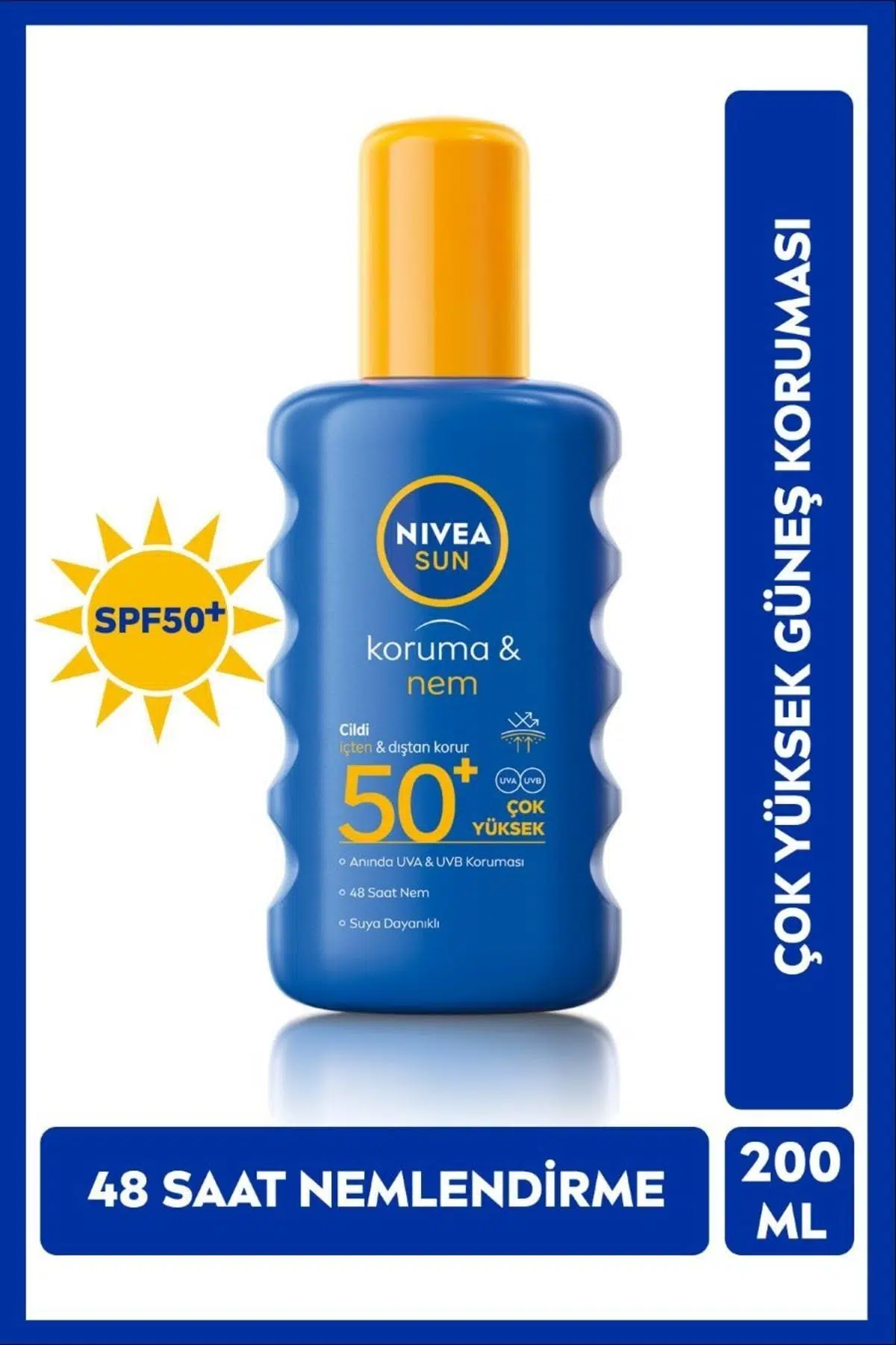 85 Yılı Aşkın Güneş Bakım Uzmanı NIVEA'dan NIVEA Sun Koruma & Nem SPF 50+ Güneş Koruma Faktörü ile Çok Yüksek Korumalı Güneş Spreyi 200 ml:;48 Saat Nemlendiricietkiye sahiptir;Yüksek etkili UVA & UVB korumasısağlar.;Cilt bariyerini destekler;Mikrobiyom dengesi ile uyumlu çalışır.;Hızlı emilimgöstererek anında etki eder.;Formülü suya dayanıklıdır;Nasıl kullanılır?: Kullanım miktarını düşürmek koruma düzeyini önemli ölçüde azaltır. Güneşe çıkmadan önce bol miktarda sürün. Tamamen emilmesini bekleyin, leke bırakmaması için kıyafetler ve sert yüzeylerle direk temasından kaçının. İlk etkisini korumak için yüzdükten, terledikten ve kurulandıktan sonra sık sık tekrarlayın. Güneşe çıkmadan önce cildinize uygulayın.;NIVEA cildinizi ve dünyayı önemsiyor: Okyanusa Duyarlı- Octinoxate oxybenzone ve octocrylene UV filtreleri ve Microplastic içermez.;Ciltle uyumu dermatolojik olarak test edilmiştir.;Güneş korumasında 85 yıllık uzman marka NIVEA’dan, güneş ışınlarına karşı yüksek etkili UVA/UVB koruması ve nemlendirme sağlayan NIVEA Sun 50+ SPF Koruma & Nem Nemlendirici Güneş spreyi. Güneş ışınlarına karşı yüksek etkili UVA/UVB koruması sağlarken 48 saat boyunca cildinizi nemlendirir. Cilt bariyerini destekler. Mikrobiyom dengesi ile uyumlu çalışır. SPF 50 güneş koruması ile cildinizi güneşe karşı korurken suya karşı dayanıklıdır.;Doğru koruyucu güneş kremi seçimi nasıl yapılır?;Koruyucu güneş kremi alırken mutlaka SPF yani güneş koruma faktörü oranına bakılıp Cilt tipinize ve ten rengine göre SPF kararı verilmelidir.;Hassas olmayan ciltler ve esmer ten için SPF 6 düşük koruma;Normal cilt tipi ve buğday ten için SPF 20 orta koruma;Hassas cilt tipi ve açık ten için SPF 30-50 yüksek koruma;Çok hassas cilt tipi ve çocuklar için SPF 50 + çok yüksek koruma;Koruyucu güneş kremi hangi sıklıkta ve nasıl uygulanmalıdır?;Kullanım miktarını düşürmek koruma düzeyini önemli ölçüde azaltır. Güneşe çıkmadan önce bol miktarda sürün. Tamamen emilmesini bekleyin, leke bırakmaması için kıyafetler ve sert yüzeylerle direk temasından kaçının. İlk etkisini korumak için yüzdükten, terledikten ve kurulandıktan sonra sık sık tekrarlayın. Kullanım miktarını düşürmek koruma düzeyini önemli ölçüde azaltır. Güneş koruyucu kullansanız bile uzun süre güneşe maruz kalmak sağlığınız için ciddi tehlike oluşturur.;Koruyucu güneş kremi ne zaman kullanılır?;Güneşe çıkmadan yarım saat önce vücuda uygulanır. Özellikle su ile temas olduktan sonra, tekrarlanır.