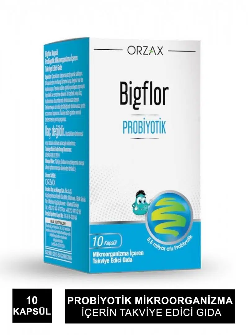Orzax Bigflor Probiyotik nedir? Orzax Bigflor, probiyotik mikroorganizmalar içeren bir gıda takviyesidir. Her kapsülde toplam 8,5 milyar probiyotik mikroorganizma, 250 mg Saccharoyces Boulardii ve 25 mg Inülin (prebiyotik) içerir. Probiyotik migroorganizmalar sindirim sistemini düzenlemeye ve başığıklık sistemini desteklemeye yardımcı olur. Orzax Bigflor Probiyotik özellikleri:- 25 mg prebiyotik içeriği- Helal sertifikalı- Kapsül kaynağı bitkiseldir.