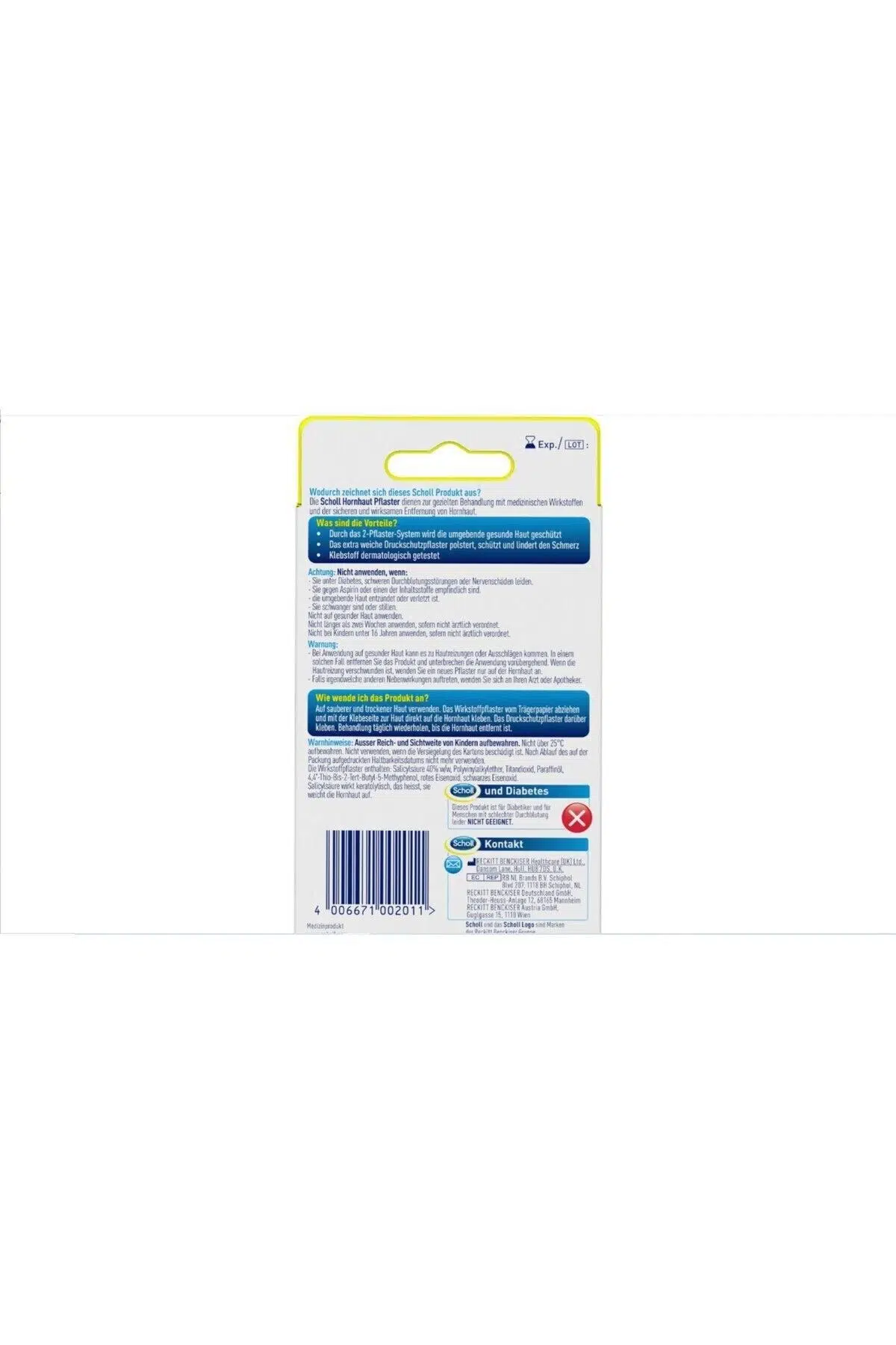 Ürün Açıklaması Scholl nasır giderici alçı özellikle güvenli bir şekilde yapışır ve nasırın giderilmesini destekler. ; Hedeflenen etki sadece pürüzlü cildi gidermekle kalmaz, aynı zamanda ağrının giderilmesini de sağlar. ; Yapıştırıcı dermatolojik olarak test edilmiştir. ; Uyarılar Kornea alçısının mukoza ile temas etmemesi, özellikle göz ile temasından kaçınılmalıdır. ; Şeker hastalığınız veya ciddi dolaşım probleminiz varsa sadece doktorun izniyle kullanın. ; Yalnızca harici kullanım içindir. ; Çocukların erişemeyeceği yerlerde saklayın. ; Lütfen broşürü dikkate alın. ; içindekiler 38,00 mg salisilik asit (ph.EUr.), 4,4'-sulfanediilbis (2-tert-bütil-5-metilfenol), poli(1-etoksietilen), titanyum dioksit, kalın parafin, demir (III) oksit, demir ( II,III) oksit. ; Kullanım talimatları Tedavi edilecek cilt alanı iyice temizlenmeli ve kurutulmalıdır. ; Aktif madde içeren flaster şeffaf filmden çıkartılır. ; Daha sonra etken maddeli flasterin yapışkan tarafı alta gelecek şekilde cildin nasırlı bölgesine yapıştırın ve üzerine basınç koruma flasterini yapıştırın. ; Aktif sıvayı günlük olarak değiştirin. ; Aktif madde içeriğindeki salisilik asit nasırları yumuşatır. ; Yaklaşık 3-4 gün sonra yumuşayan nasırlar ılık ayak banyosuyla giderilebilir. ; İnatçı vakalarda tedaviyi tekrarlayın. ; Çocuklar aynı anda birden fazla yama;