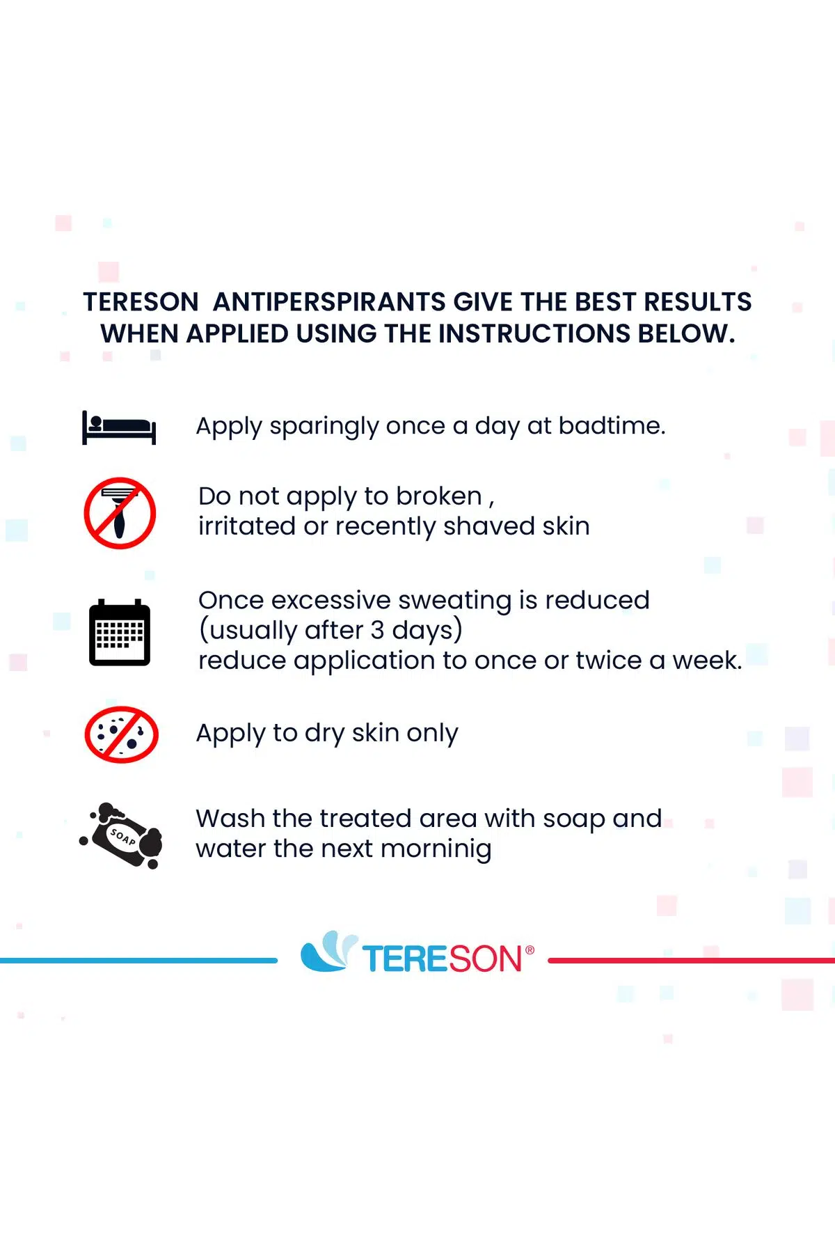 Tereson aşırı terlemeyi önlemeye karşı özel olarak geliştirilmiş etkili bir sprey antiperspiranttır. ; Koltuk altı, ayak ve el terlemelerinde kullanım için idealdir. ; Başlangıç olarak her gece yatmadan önce kullanılır. Etkisi ertesi gün hissedilmeye başlayacaktır. ; Terlemeyi 1-2 günde kontrol altına alacaktır. Terleme kontrol altına alındıktan sonra kullanmaya ara verilebilir. ; İçeriği : Etil Alkol , Demineralized Water, Aluminium Chloride Hexahydrate. ;